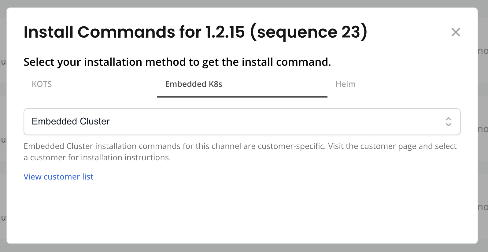 noteThe Embedded Cluster installation instructions are customer-specific. Click View customer list to navigate to the page for the target customer. For more information, see Get Customer-Specific Installation Instructions for Helm or Embedded Cluster below.